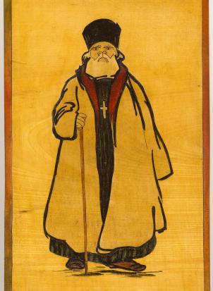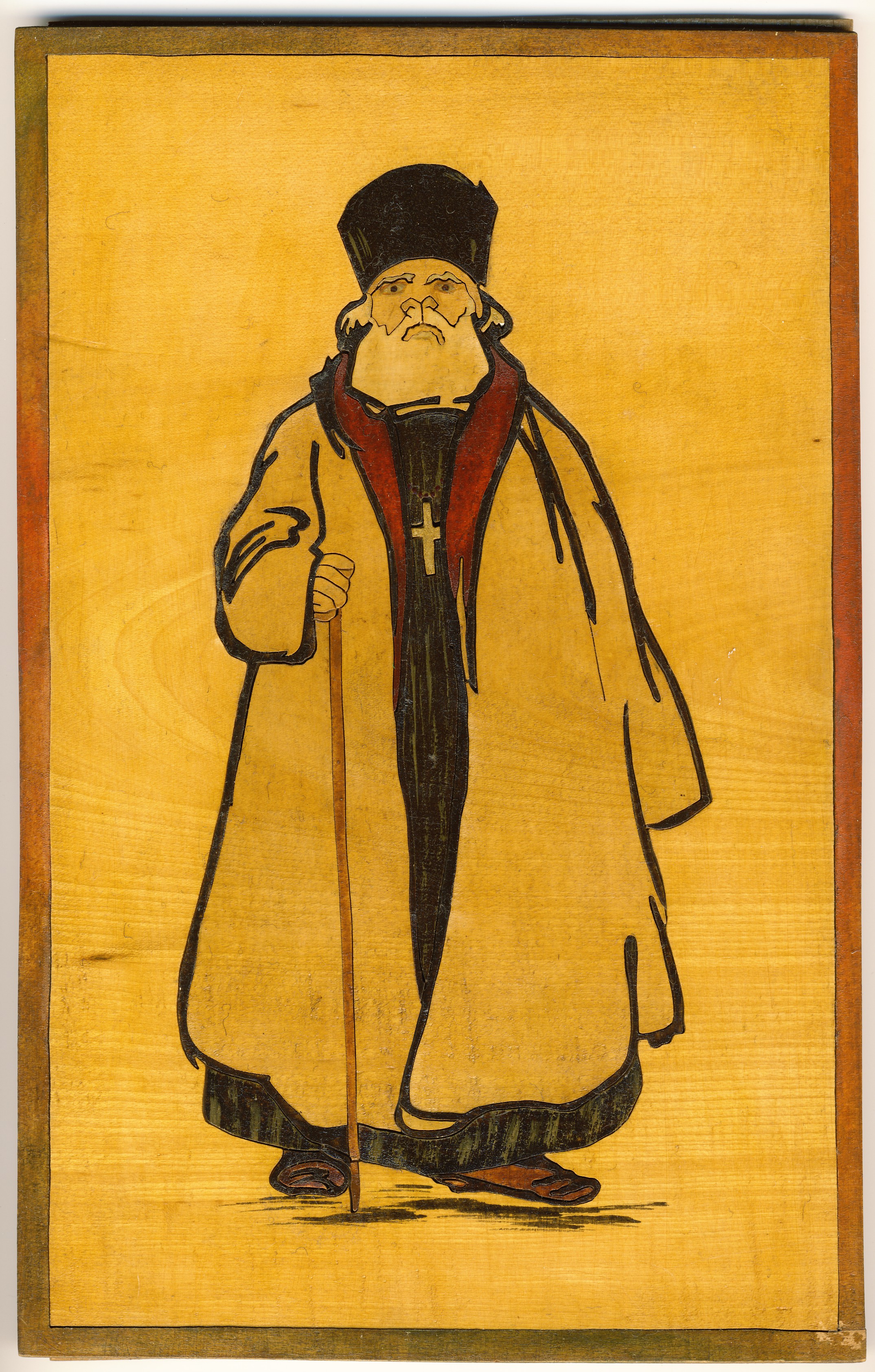 A képen egy finoman kidolgozott, mozaikszerű lombfűrészmunka látható, amely egy pópát ábrázol.