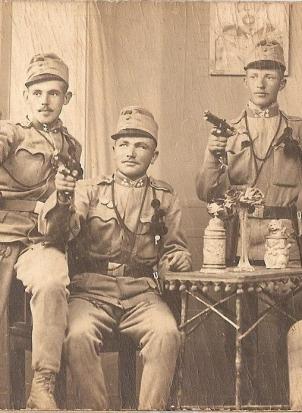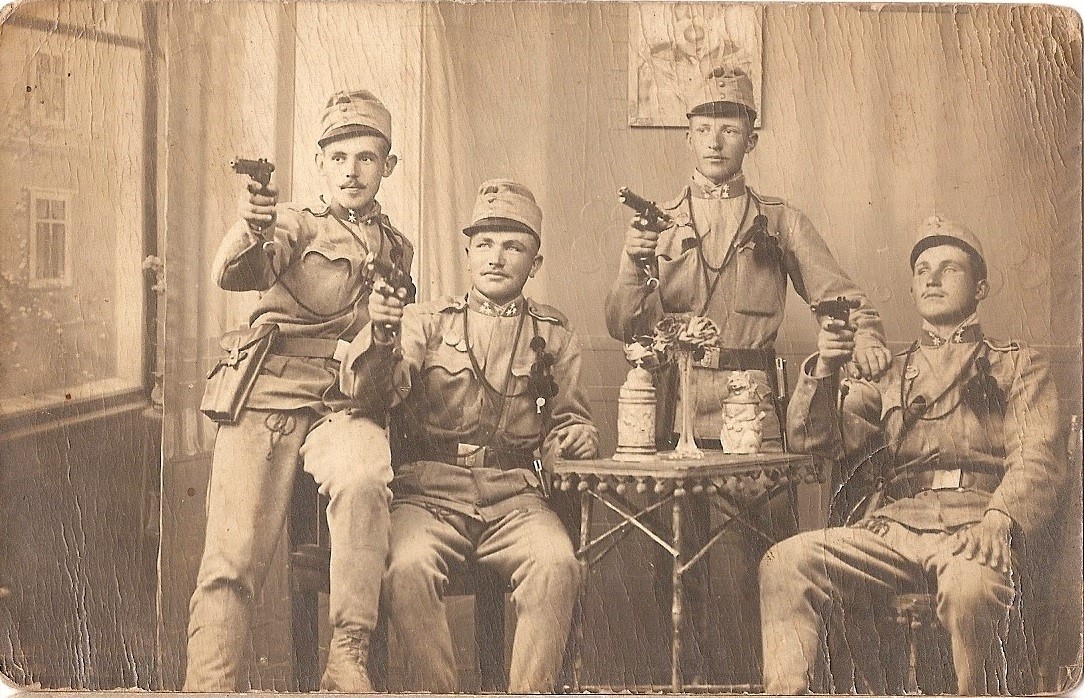A képen Stepanek Alajos dédapja, Stepanek Alajos látható katonatársaival Roth-Steyr 1907 M pisztollyal a kezükben.